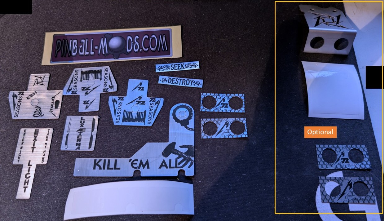 These custom designed decals are laser etched onto brushed-metallic, high quality decal material providing a much needed dress up for several areas of Stern's Metallica Remastered Pinball machine. This decal set is Made in the USA using materials created in the USA. These are laser etched and cut into the decal material making the markings virtually indestructible resulting in a higher quality product.